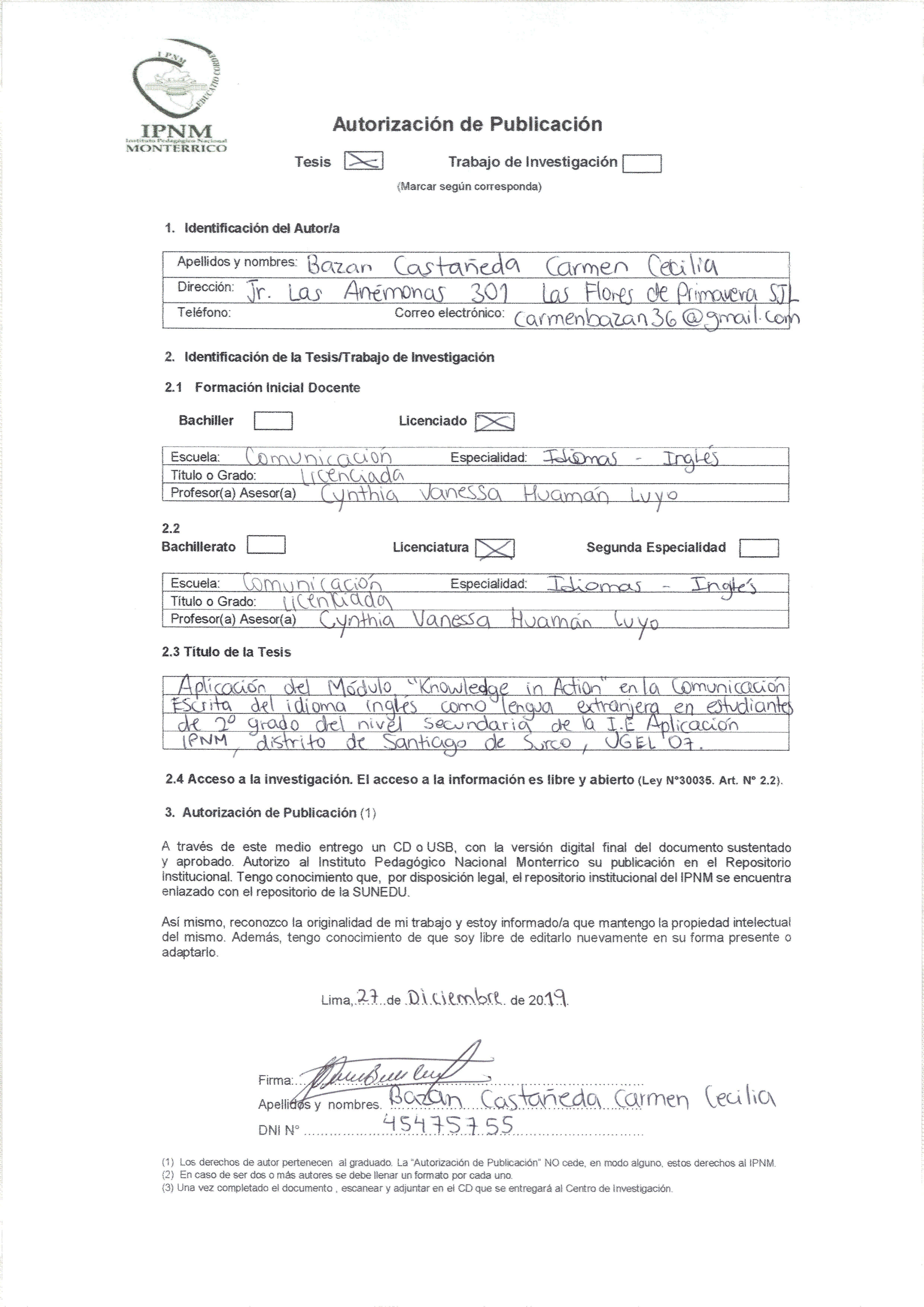 Aplicación del módulo “Knowledge in Action” en la comunicación escrita del idioma inglés como lengua extranjera en estudiantes de 2° grado del nivel secundaria de la I.E. Aplicación IPNM, distrito de Santiago de Surco, UGEL 07
