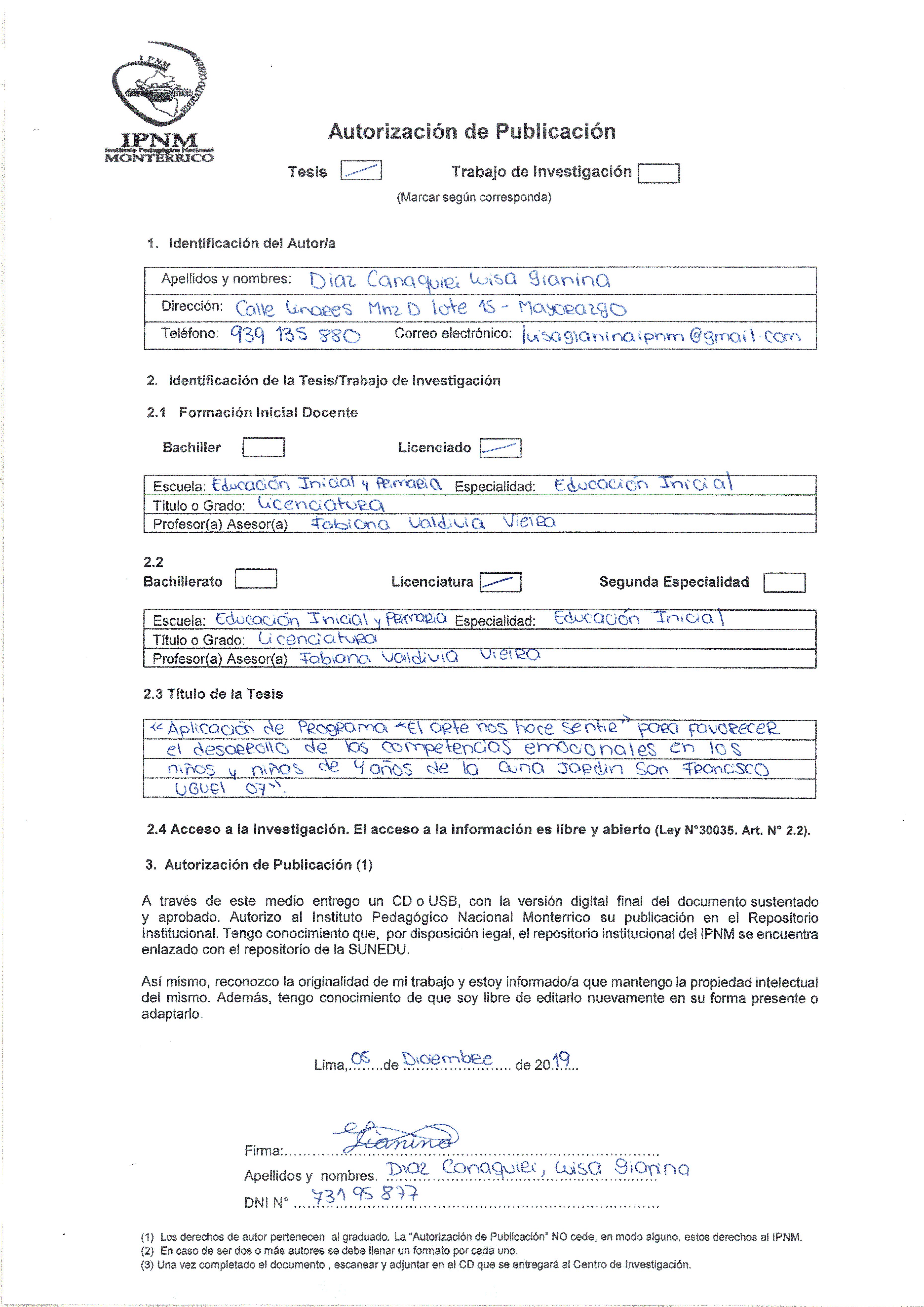 Programa de Formación Inicial Docente. Tesis para optar el título profesional de Licenciado en Educación Inicial